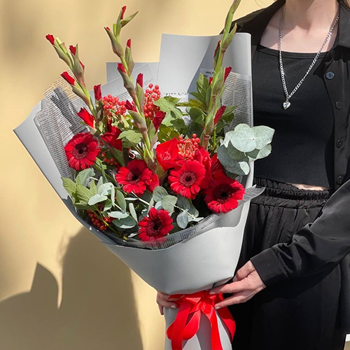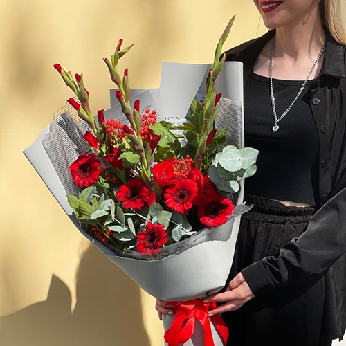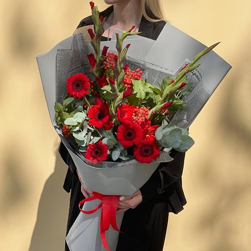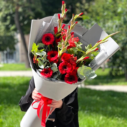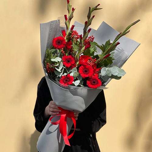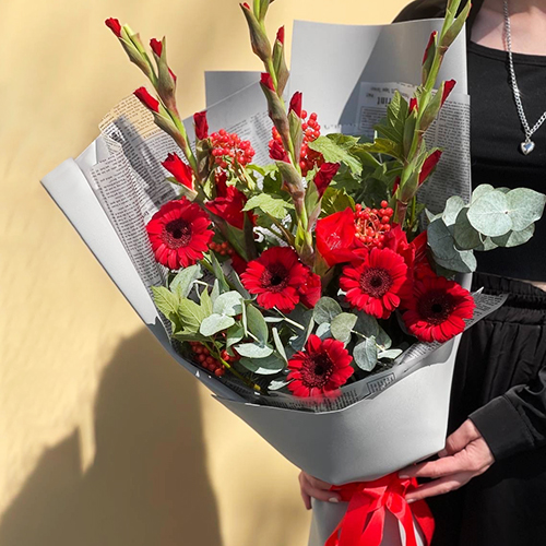 Букет "Счастливый день" из гладиолусов, калины и гербер