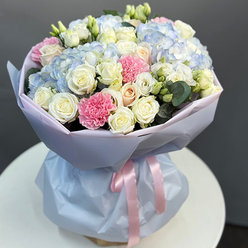 Букет "Джиа" из гортензий, кустовых роз и диантусов