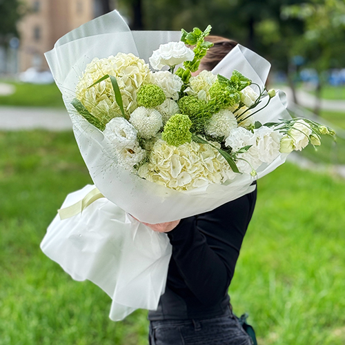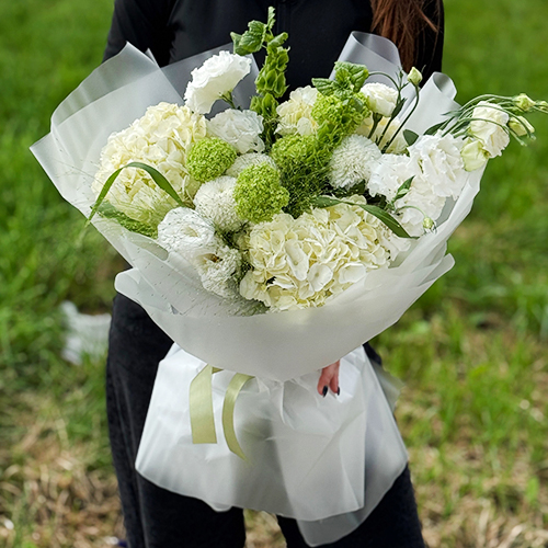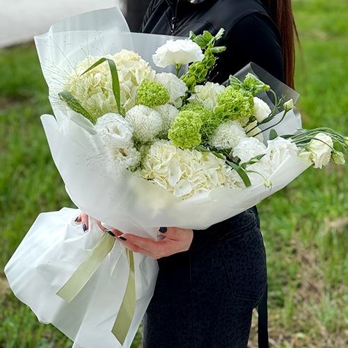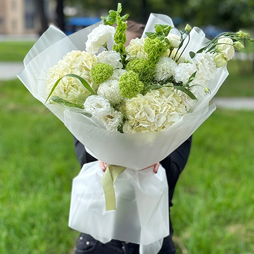 Букет "Летняя прохлада" из гортензий, хризантем Момоко, паникума, молюцеллы, эустом и вибирнума