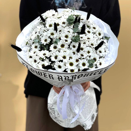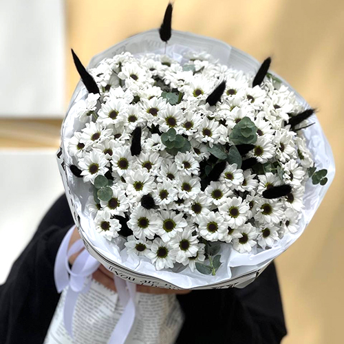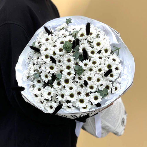 Букет "Белая ночь" из хризантем сантини, лагуруса и веточек эвкалипта
