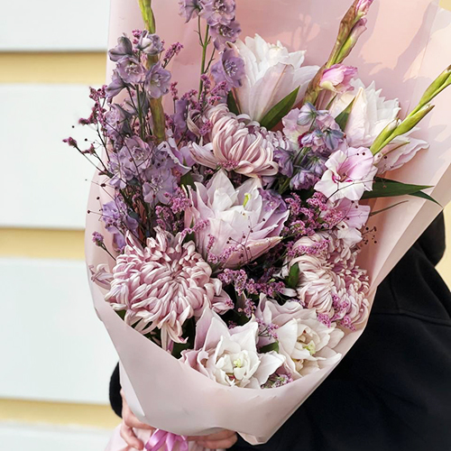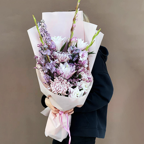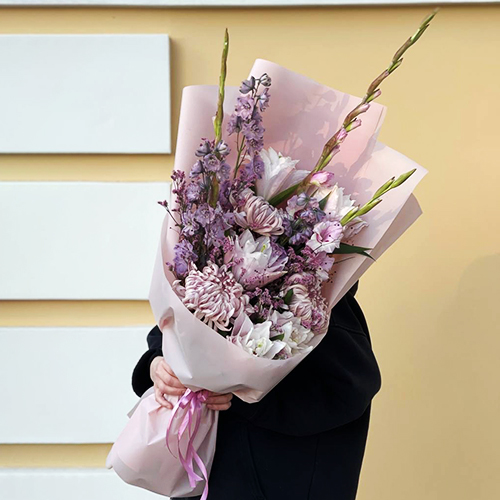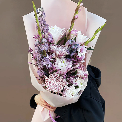 Букет "Нежное забвение" из хризантем Виена, гладиолусов, талинума, дельфиниума и пионовидных лилий