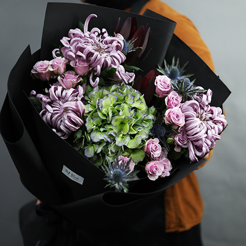 Букет "Бессоница" из хризантем Виена, сафари, кустовых роз, Голландской гортензии и эрингиума