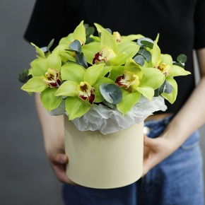 Композиция в шляпной коробке из 11 лаймовых орхидей