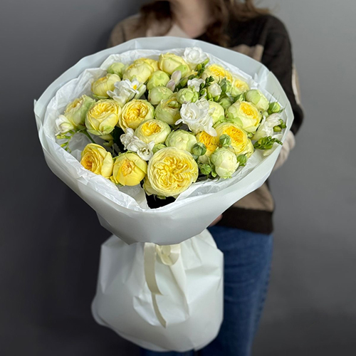 Букет "Всё решено" из лимонных пионовидных кустовых роз и ароматных фрезий