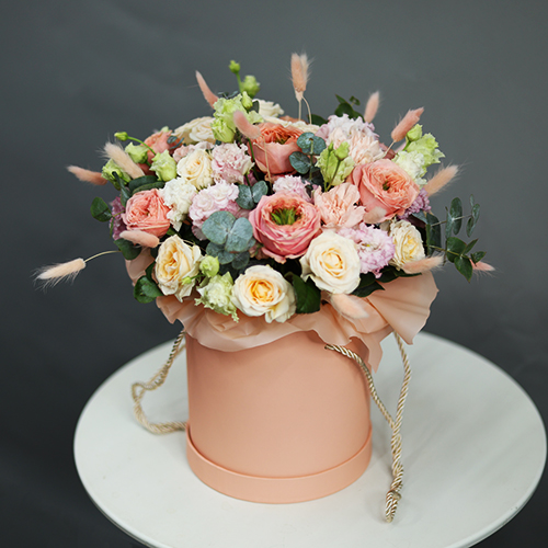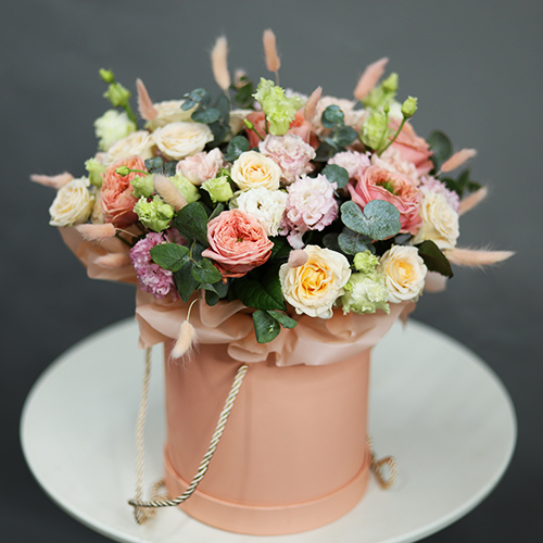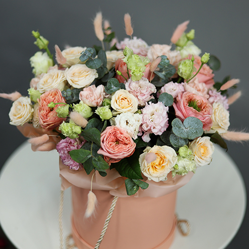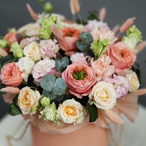 Композиция в шляпной коробке "Бабочка" из пионовидных роз, эустом и лагуруса