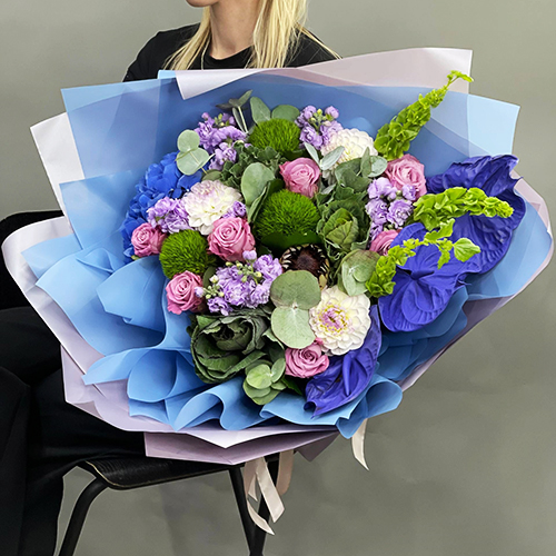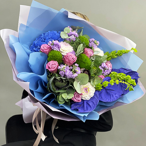 Букет "Люкс визаж" из Голландской гортензии, антуриума, диантуса люкс, брассики, ароматной маттиолы, протеи, георгин и моллюцелы