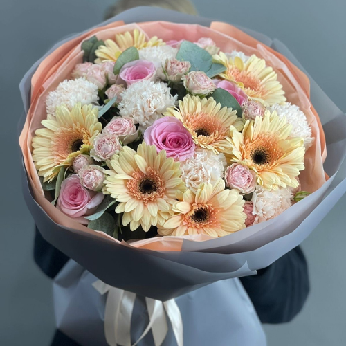 Букет "Пич мадам" из пионовидных кустовых роз, гербер и диантусов