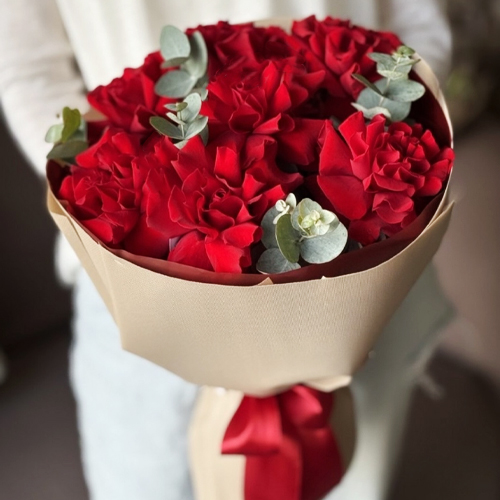 Букет "Красная пантера" из 7 роз Эквадор и эвкалипта