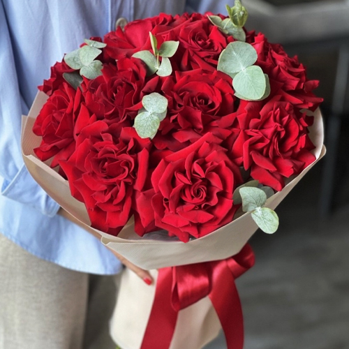 Букет "Красная пантера" из 13 роз Эквадор и эвкалипта