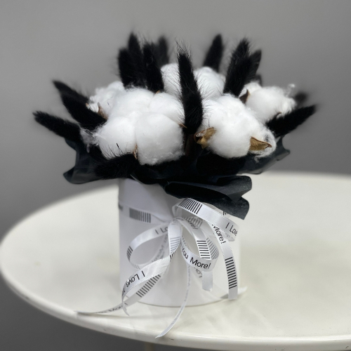 Композиция в шляпной коробке мини "Чикатуха" из хлопка и лагуруса