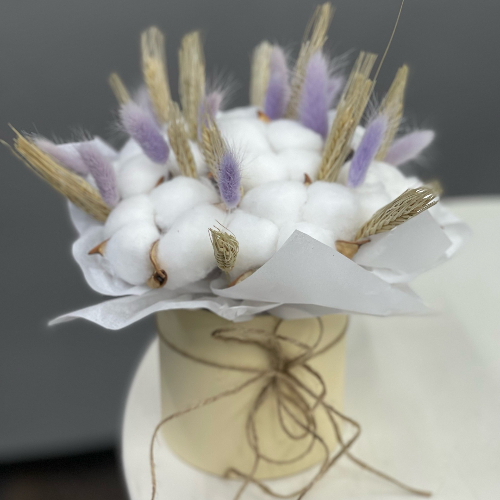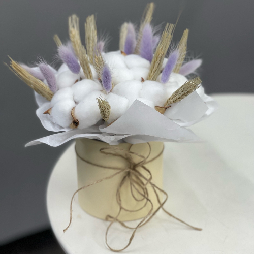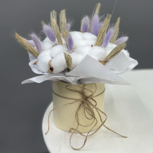 Композиция в шляпной коробке из хлопка, лагуруса и пшеницы (Сухоцвет)